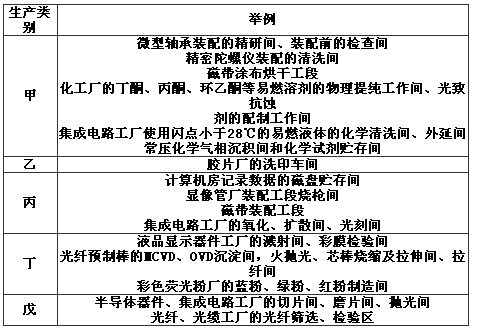 表B 潔凈廠房生產(chǎn)工作間的火災(zāi)危險性分類舉例:
