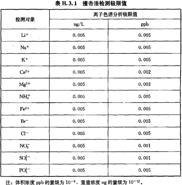 H.3.1 撞擊采樣法適用于檢測(cè)空氣中的陰陽(yáng)離子(Li+、Na+、K+、Ca2+、Mg2+、Fe2+、Br-、Cl等)的濃度。檢測(cè)限值可按表H.3.1執(zhí)行。