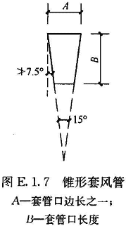 E.1.7 選用套管法時,可用輕質(zhì)板材或膜材做成與風口內(nèi)截面相同或相近、長度大于2倍風口邊長的直管段作為輔助風管,連接于過濾器風口外部,在套管出口平面上,均勻劃分小方格,方格邊長不大于200mm,在方格中心設(shè)測點。對于小風口,最少測點數(shù)不少于6點。也可采用錐形套管,上口與風口內(nèi)截面相同或相近,下口面積不小于上口面積的一半,長度宜大于1.5倍風口邊長,側(cè)壁與垂直面的傾斜角不宜大于7.5°,以測定截面平均風速,乘以測定截面凈面積算出風量(圖E.1.7)。